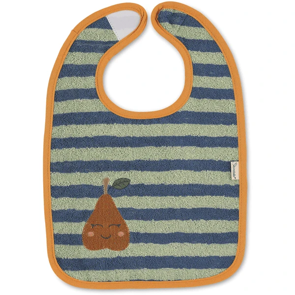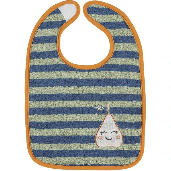 Het praktische klittenband slabbetje, voor gemakkelijk aan- en uitkleden. Gemaakt van zachte badstofkwaliteit met opgestikt perenmotief, passend bij de “Emmilius” ezelserie.