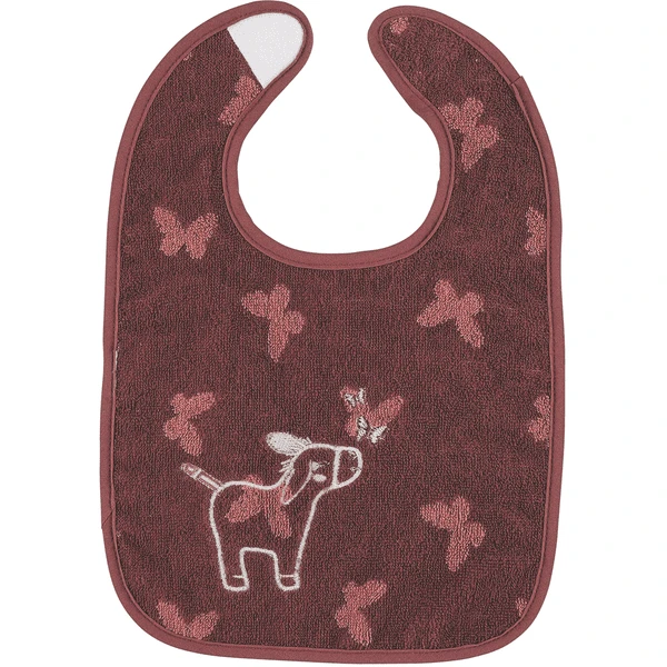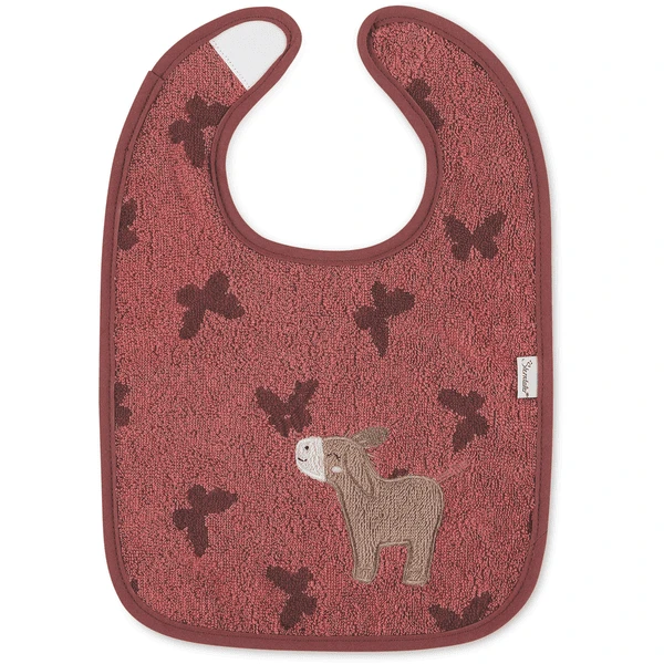 Het praktische klittenband slabbetje, voor gemakkelijk aan- en uitkleden. Gemaakt van zachte badstof kwaliteit met geborduurde ezel “Emmily”.