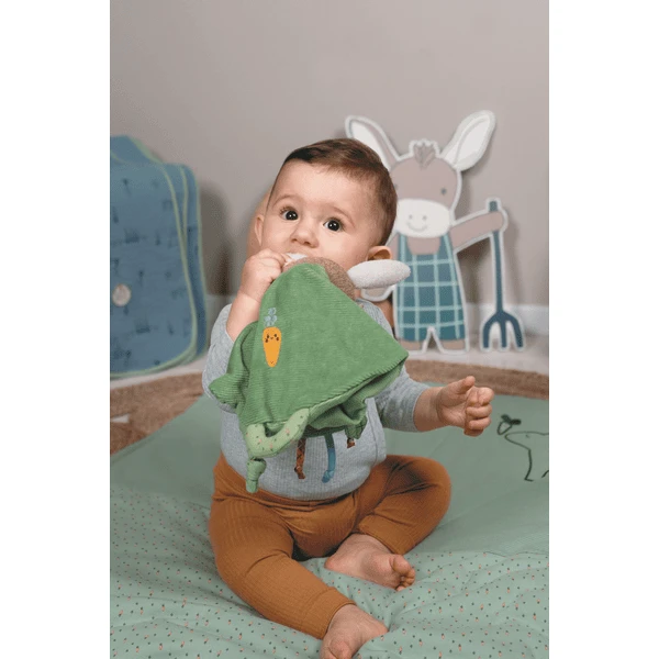 Je kleine schat zal vanaf dag één een geweldige metgezel hebben door dik en dun. Mooie details zoals hoeken, knopen, de schattige wortelapplicatie en een halve ring willen door kleine handjes verkend worden. Het knuffeldoekje behoort tot de Sterntaler “Kindergarten Collection” – het is niet uitgerust met een rammelaar of pieper – en kan dus aan de zijde van uw lieveling blijven tijdens stille tijd in de kleuterschool zonder andere kinderen te storen. Net als veel andere producten uit de Donkey Emmilius serie kan dit artikel gemakkelijk gewassen worden in het easy-care wasprogramma op 40°C.
