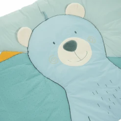 Baby’s eerste speeltuin! De zachte kruipdeken van poly cotton , fleece en jersey, met motief beer “Ben”. Met pieper en knisperend papier.