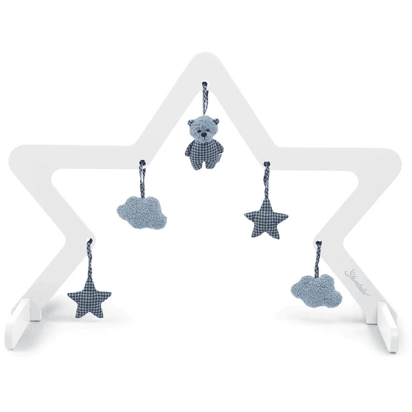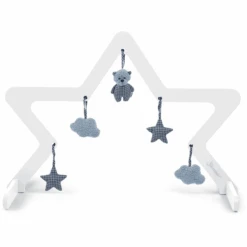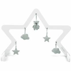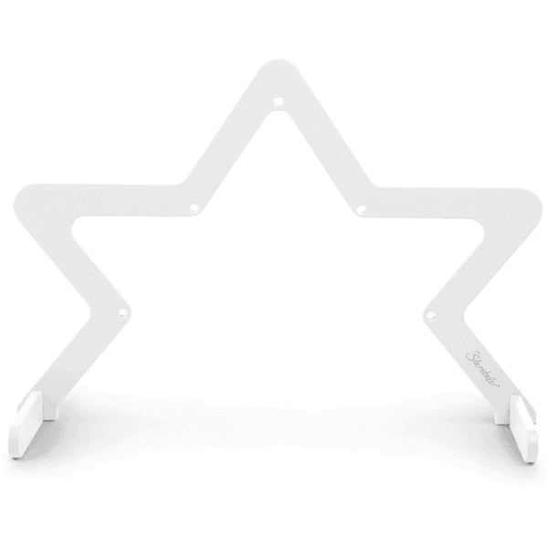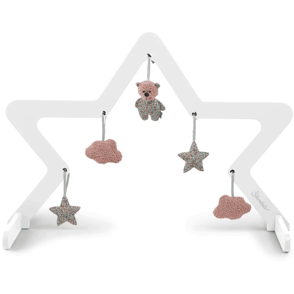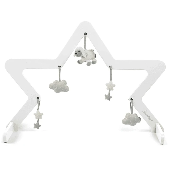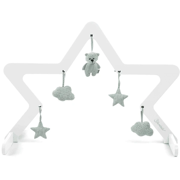 Speelboog houten ster (wit) van Sterntaler. Op verschillende hoogtes zijn er bevestigingsmogelijkheden voor verschillende speelstukken, die steeds opnieuw kunnen worden geruild. Dit zorgt voor flexibiliteit en afwisseling.