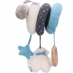 - Elia de ijsbeer van pluizige stof en tricot met rammelaar en houten grijpring van beukenhout stimuleert grijpen, spelen en ontdekken